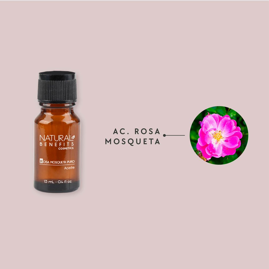 Concentrado en rosa mosqueta pura, este aceite aporta ácidos grasos esenciales y antioxidantes que regeneran la piel, mejoran su elasticidad y ayudan a reducir manchas, cicatrices y líneas finas.