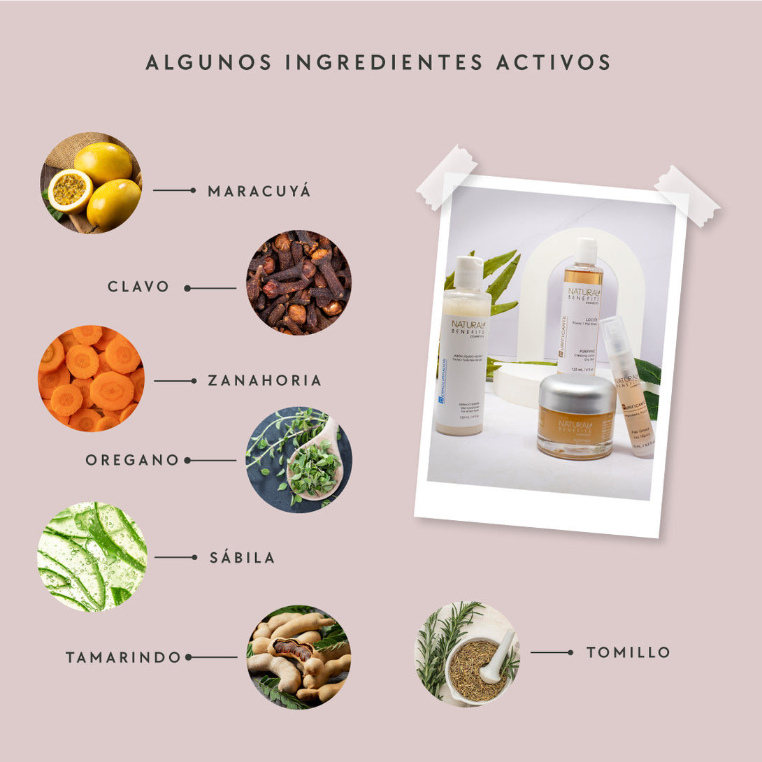 Formulado con Extractos de Sábila, Clavo, Tomillo, Tila, Zanahoria, Orégano y Maracuyá; Arcillas de Lecho Marino, este tratamiento actúa como un circuito completo de limpieza y control, previene imperfecciones, mejorar la textura y equilibrar la producción de sebo.