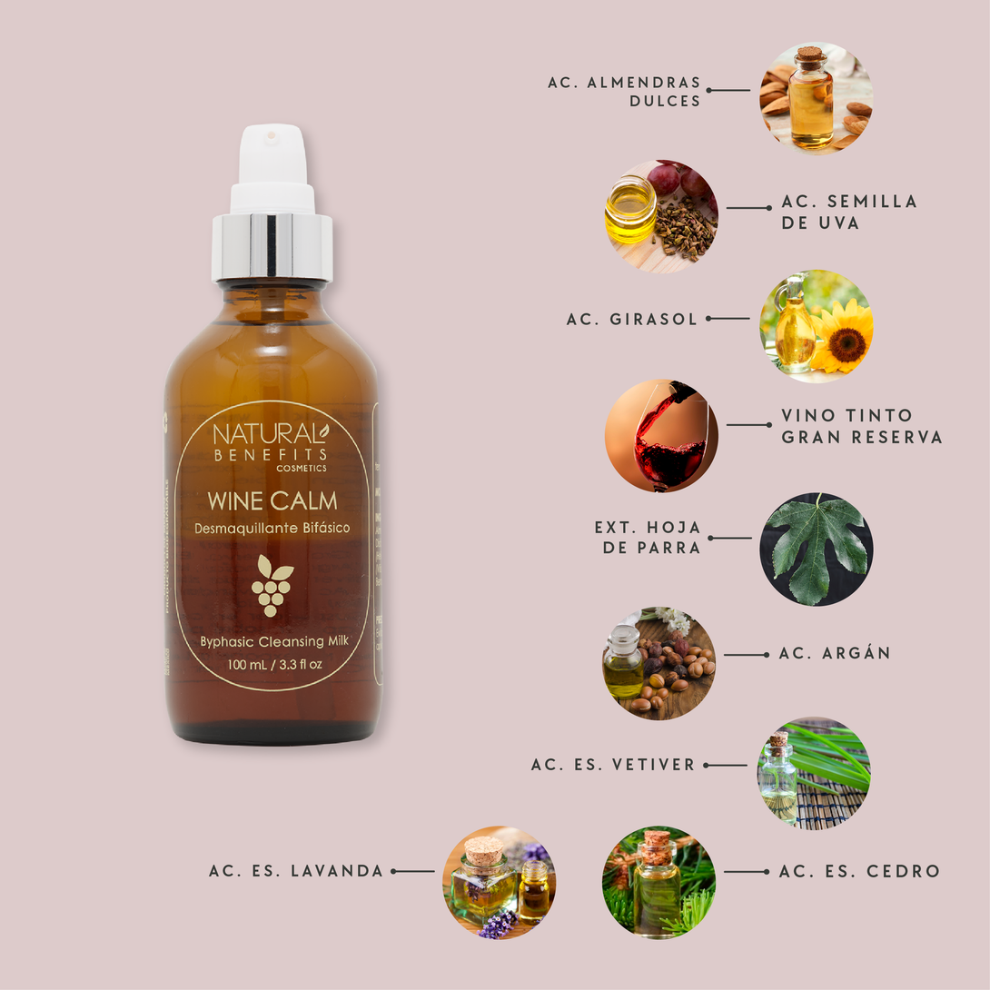 Formulado con Vino Tinto Gran Reserva, Semilla de Uva, Extracto de Hoja de Parra, Resveratrol y Rhodophyceae Hidrolizado, Aceite de almendras dulces, aceite de girasol, aceite de argán, este desmaquillante bifásico elimina eficazmente el maquillaje e impurezas mientras hidrata y protege la piel sin irritarla, mientras sus antioxidantes naturales calman, suavizan y revitalizan la piel del rostro, ojos y labios.