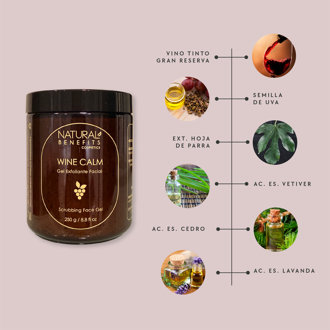 Formulado con Vino Tinto Gran Reserva, Semilla de Uva, Extracto de Hoja de Parra y Aceites Esenciales Cedro y Lavanda, este exfoliante facial antioxidante elimina suavemente las células muertas, estimulando la microcirculación, Rejuvenece, oxigena y mejora la textura de la piel, aportando un brillo saludable y radiante.